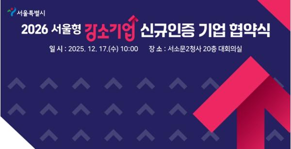 서울시는 지난 9월 ‘2026년 서울형 강소기업’으로 신규 인증한 48개사와 청년 정규직 채용 확대 및 일·생활 균형이 가능한 근무환경 조성을 약속하는 '2026년 서울형 강소기업 신규 인증 협약식'을 12월 17일(수) 서울시청 서소문2청사에서 개최했다고 밝혔다.