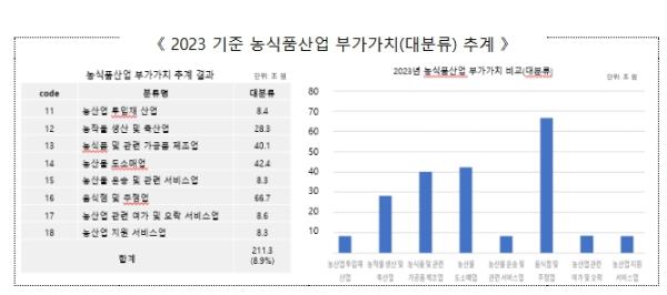 농림축산식품부, '23년 농식품산업 부가가치 211조 원, 전체 산업의 8.9% 차지하는 것으로 나타나
