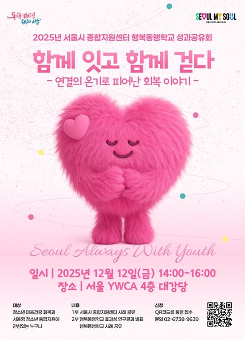 서울시는 지난 12월 12일 서울YWCA 대강당(중구 명동)에서 청소년과 보호자, 시설 관계자 등 130여 명이 참석한 가운데 '2025 청소년행복동행학교‧청소년종합지원센터 성과공유회'를 개최했다. ‘함께 잇고 함께 걷다’를 주제로 지난 1년간 서울시가 추진해 온 위기청소년 지원 사업의 운영 성과와 주요 사례를 공유하고 향후 발전 방향을 논의했다.