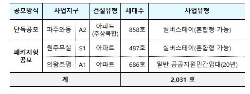 ②택지공모는 약 2천호 규모로 실시하며, 사업 대상지는 파주와동 A2 블록, 원주무실 S1 블록, 의왕초평 A1 블록 총 3곳이다. 파주와동 A2 블록과 원주무실 S1 블록은 실버스테이로, 의왕초평 A1 블록은 임대의무기간이 20년인 일반 공공지원민간임대로 공급한다.