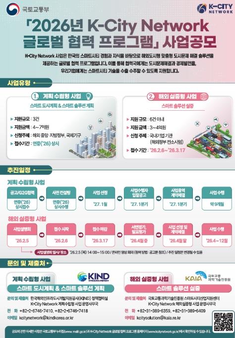 국토교통부 김연희 도시경제과장은 “K-City Network 글로벌 협력사업은 해외 도시와 함께 스마트도시를 기획하고 현장에서 실증까지 이어지는 대표적인 글로벌 협력 플랫폼”이라며, “2026년에는 AI 융합 스마트 솔루션의 해외 적용을 확대해 우리기업의 지속가능한 해외수출과 글로벌 경쟁력 강화를 적극 지원하겠다”고 밝혔다.