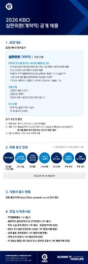 이번 채용은 KBO 야구심판 양성과정 수료자(2026년 야구심판 양성과정 수료 예정자 포함) 또는 대한야구소프트볼협회(KBSA) 및 산하단체, 독립리그 소속 심판으로 1년 이상의 심판 활동 경력(단체장 직인 필수) 보유자에 한해서 지원이 가능하다. 최종 합격자는 2026 KBO 공식 심판위원으로 활동하게 되며, 근무 종료 후 평가 결과에 따라 정규직 전환이 검토된다.