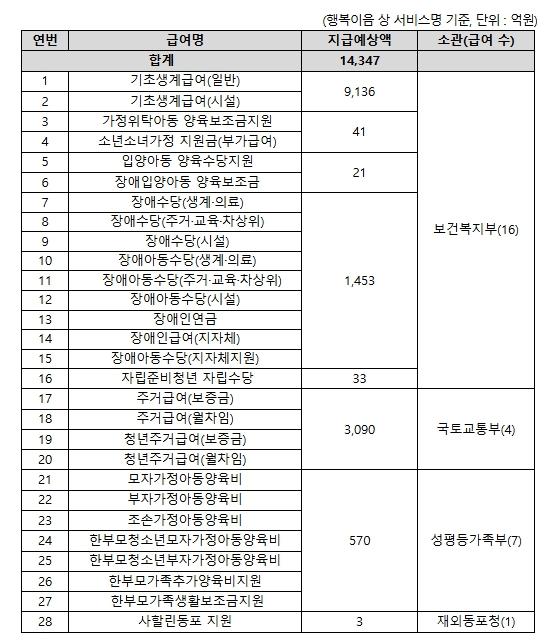 조기지급 대상은 생계급여와 주거급여를 비롯해 장애수당·장애인연금, 입양아동 양육수당, 자립준비청년 자립수당, 가정위탁아동 양육수당, 한부모가족 지원, 사할린동포 지원 등 총 4개 부처 소관 28종 복지급여로, 보건복지부·국토교통부·성평등가족부·재외동포청이 함께 참여한다.