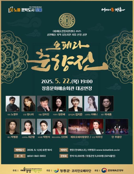 총 5막으로 구성된 오페라 ‘춘향전’은 춘향역에 소프라노 이예니, 이도령 역에 테너 하세훈, 사또역에 바리톤 박현석, 월매역에 메조 소프라노 신선희, 방자역에 테너 박병준, 향단이역에 소프라노 차근영이 참여해 열연할 예정이다.