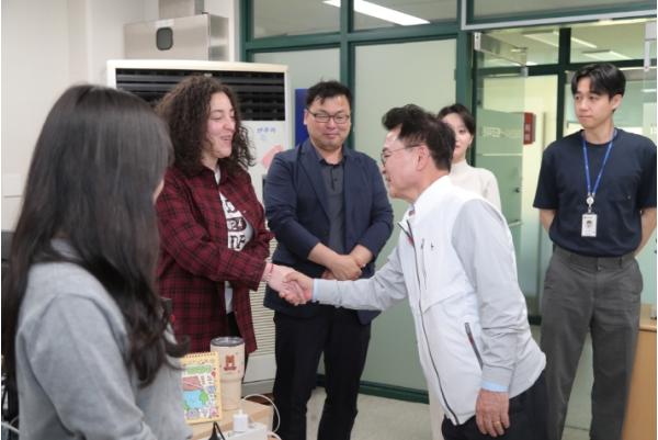 춘천시가 세계태권도품새선수권대회 유치에 성공한 가운데, 육동한 춘천시장이 14일 춘천레저태권도조직위원회 사무실을 방문해 관계자들을 격려했다.