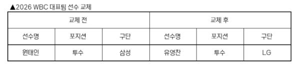 KBO 전력강화위원회는 부상으로 인해 WBC 참가가 어려워진 삼성 원태인을 대체할 선수로 LG 유영찬을 확정하고 WBC 조직위에 선수 교체 승인을 요청했다.