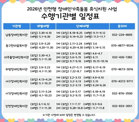 인천시에 거주하는 장애인가족이라면 거주 지역과 관계없이 각 복지관의 일정에 맞춰 신청할 수 있다.