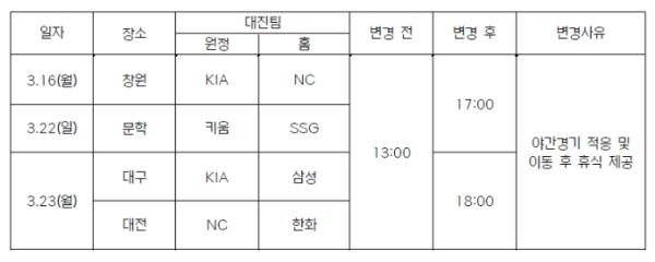 2026 KBO 시범경기 중 일부 경기의 개시 시간이 야간경기 적응 및 이동 후 휴식 제공을 위해 변경됐다.