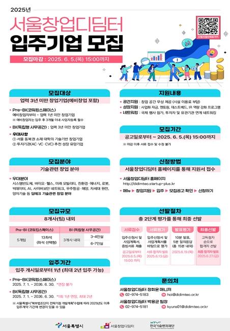 서울시는 동북부권 지역의 창업 활성화를 선도하는 ‘서울창업디딤터’에입주할 신규 기업 8개사를 5월 16일부터 6월 5일까지 3주간 스타트업플러스 플랫폼을 통해 모집한다고 밝혔다.
