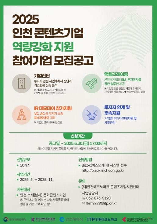 ‘2025 인천 콘텐츠기업 역량강화 지원사업’은 △사업모델(BM) 고도화 △투자유치 역량 강화 △투자자 연계 등 맞춤형 지원을 통해 인천의 문화콘텐츠 기업에 스케일업(Scale-up) 및 투자유치 기회를 제공하는 사업이다.