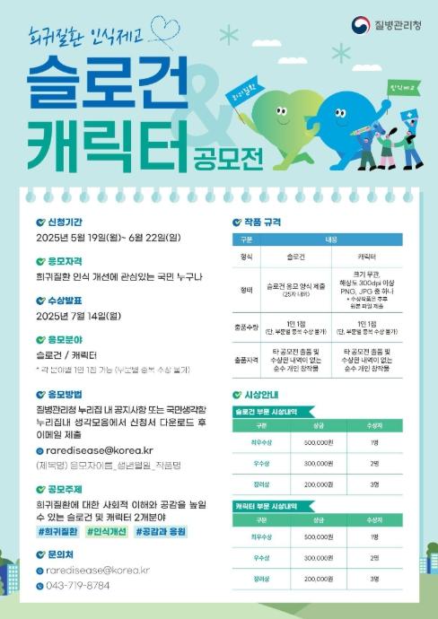 질병관리청은 희귀질환에 대한 사회적 관심을 높이고 공감대를 확산하기 위해 '2025년 희귀질환 인식 제고 슬로건·캐릭터 공모전'을 5월 19일부터 6월22일까지 약 한 달간 개최한다.