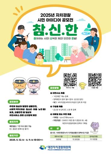 대전시 자치경찰위원회는 생활 속 치안 문제 해결을 위한 시민 참여형 정책 발굴 프로그램인 ‘2025년 자치경찰위원회 참신한 시민 아이디어 공모전’을 개최하고, 오는 6월 9일까지 시민 제안을 접수받고 있다.