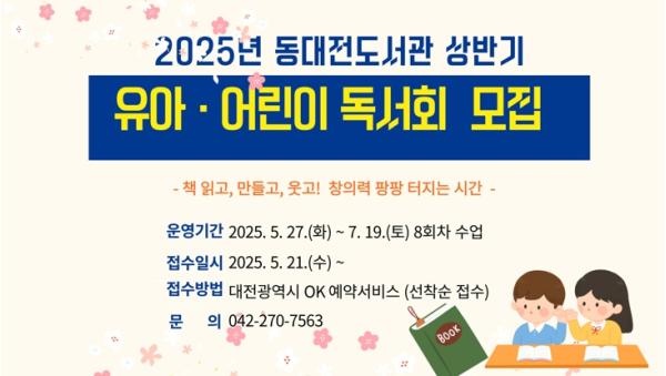 대전 동대전도서관은 유아와 어린이의 자기 주도적 독서 습관 형성과 독후 활동 지원을 위해, 2025년 상반기 유아·어린이 독서회 프로그램을 이달 27일부터 운영한다.