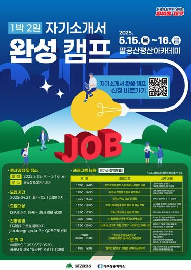 대구광역시는 5월 15일부터 16일까지 팔공산 평산아카데미에서 지역 청년 40명을 대상으로 ‘1박 2일 자기소개서 완성 캠프’를 진행한다. 이번 캠프는 지역 청년들의 실질적인 취업역량 강화를 돕기 위해 마련됐다.
