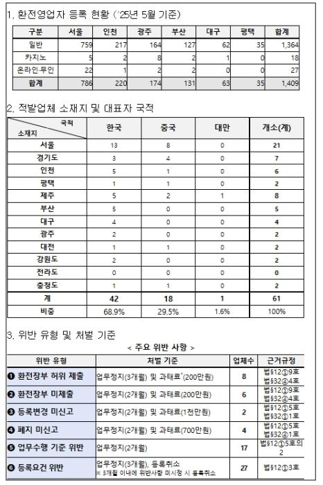 관세청은 국내 총 1,409개 환전업체 중에 고위험 일반 환전소 127개 사를 선별하여 ’25년 3월부터 5월까지 3개월간 집중단속을 실시한 결과, 61개 환전업체에서 불법행위를 적발, 업무정지, 과태료 부과, 범칙조사 등 제재조치를 취했다고 밝혔다.