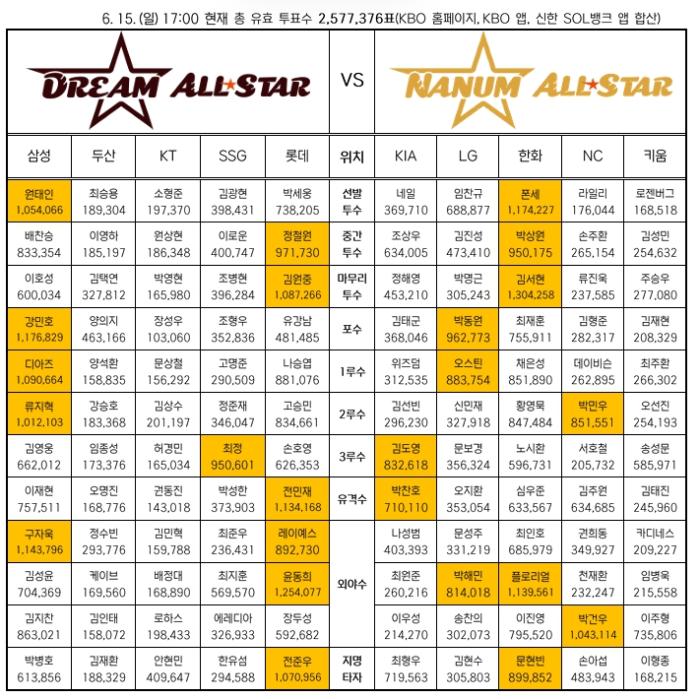 지난 2024 시즌에 이어 역대 2번째 전반기 600만 관중 돌파를 앞두고 있는 KBO 리그의 열기는 올스타 팬 투표에도 이어지고 있다. 2차 중간 집계 결과 총 투표수 257만 7,376표로, 2024 올스타전 2차 중간 집계 때의 234만 1,719표 보다 약 10% 증가했다.