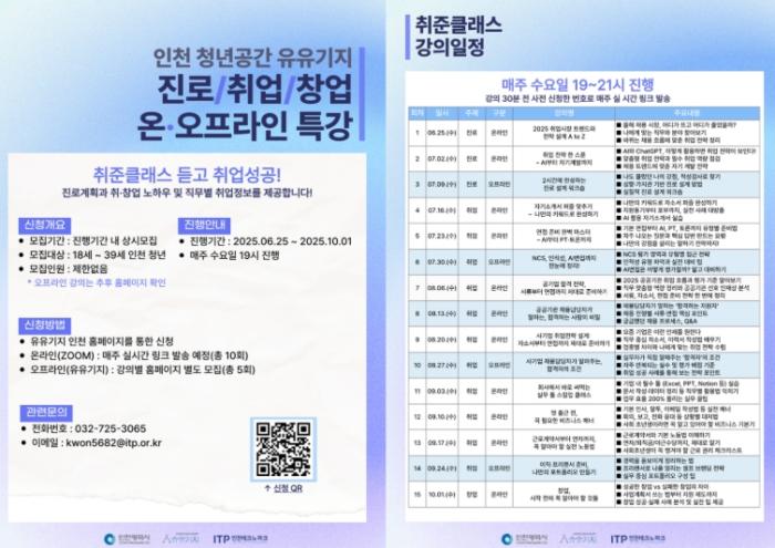 ‘취준클래스’는 인천 청년을 대상으로 취·창업 관련 노하우를 제공하는 프로그램으로, ▲2025년 취업시장 트렌드와 전략 설계 ▲성향·가치관 기반 진로 설계 워크숍 ▲나만의 키워드로 완성하는 자기소개서 작성법 ▲AI/PT 토론 준비 ▲창업 사업계획서 작성 등의 강의가 온라인 10회, 오프라인 5회에 걸쳐 개설된다.