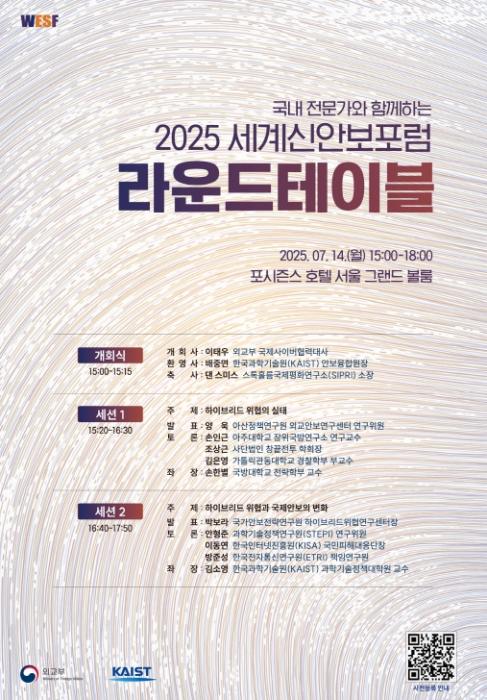 • 외교부는 2025 「세계신안보포럼(World Emerging Security Forum, WESF, 9.8.(월) 개최 예정)」을 앞두고 정부와 국내 전문가 간 논의를 촉진·심화하기 위하여 7월 14일 한국과학기술원(KAIST)과 공동으로 라운드테이블을 개최했다.