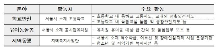 선발된 참여자는 초등 늘봄학교, 공·사립 유치원, 지역사회 복지시설 등 돌봄과 안전이 필요한 현장에 배치된다. 특히 초등학교 등하교 안전지도, 유치원 급식·돌봄 보조, 지역사회복지시설 운영 보조 등 ‘안전도시 서울’을 위한 생활 밀착형 돌봄·안전 분야에 집중된다.