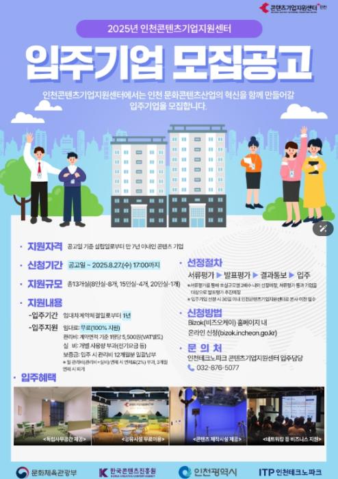 • 인천테크노파크(인천TP)는 부평구에 있는 인천콘텐츠기업지원센터에 입주할 입주기업 13개 사를 신규 모집한다.