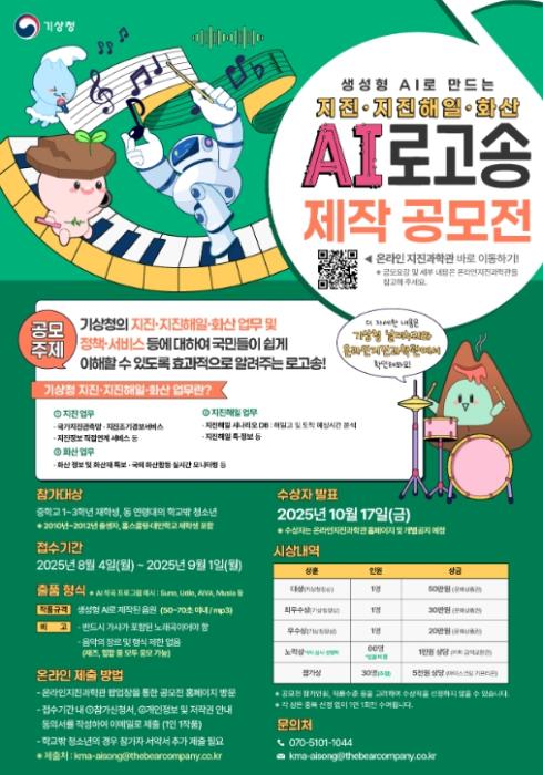 • 기상청은 8월 4일부터 9월 1일까지 지진·지진해일·화산 정보 서비스 이해도와 지진재난에 대한 안전의식 수준을 높이기 위해, 전국의 중학생을 대상으로 '2025년 기상청 지진·지진해일·화산 인공지능(AI) 로고송 공모전'을 개최한다.