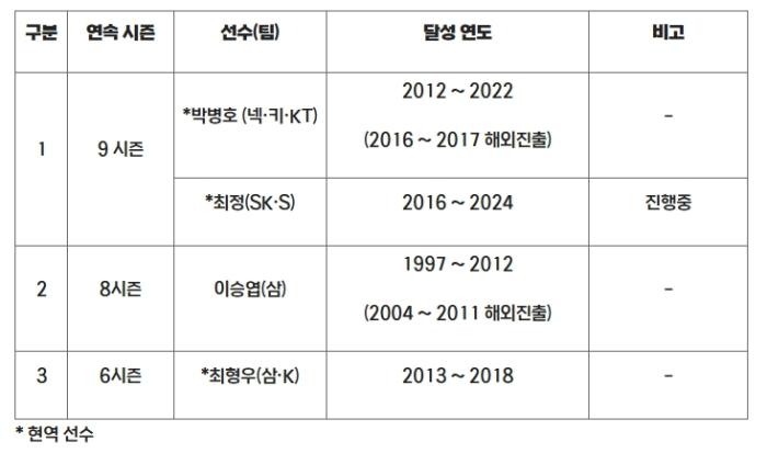현재 KBO 리그 최다 연속 시즌 20홈런 기록은 삼성 박병호와 최정 두 명이 가지고 있는 9시즌 연속이다. 8월 30일 현재 시즌 18개의 홈런을 기록 중인 최정은 앞으로 2개의 홈런을 추가할 경우, 10시즌 연속 20홈런을 달성하며 이 부문 단독 1위에 오르게 된다.