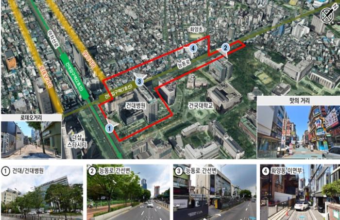 대상지는 지하철 환승역인 건대입구역을 포함하여 대중교통 이용이 편리하며, 주변에 건국대학교, 대학병원, 대규모점포 등이 입지한 지역이다. 또한, 이면부는 외식업, 패션잡화 중심의 저층 소규모 소매업이 밀집해 상권을 이루는 등 다양한 기능이 복합되어 있다.