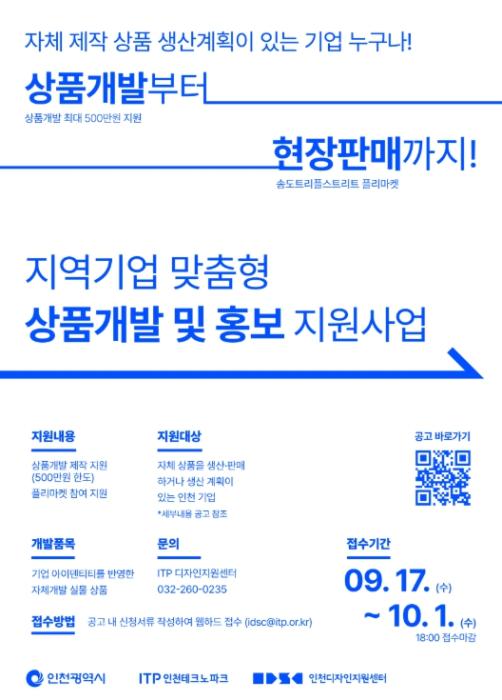 • 인천테크노파크(인천TP)는 오는 10월 1일까지 ‘2025년도 인천광역시 지역기업 맞춤형 상품개발 및 홍보 지원사업’에 참여할 중소기업을 모집한다.