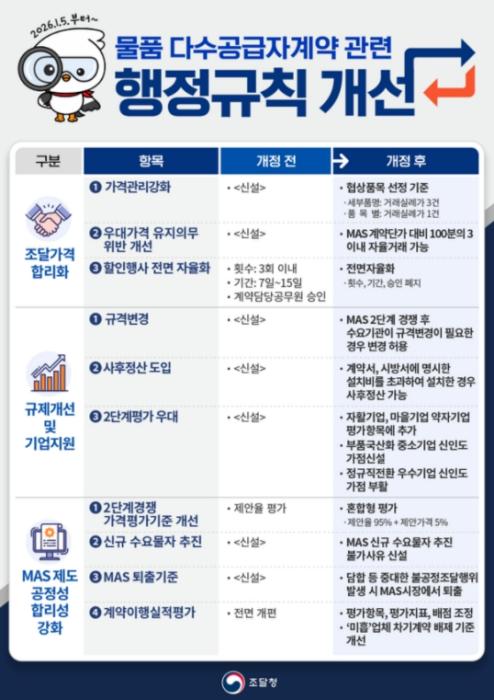 • 조달청은 조달 가격의 신뢰성을 높이고, 공공조달에 남아 있는 불합리한 규제를 혁파하기 위해 '물품 다수공급자계약 관련 행정규칙 2종'을 개정하여 2026년 1월 5일부터 시행했다고 밝혔다.