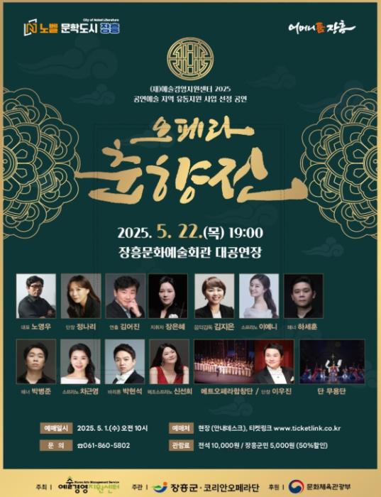 • 장흥군은 현제명의 오페라 ‘춘향전’이 5월 22일 오후 7시 장흥문화예술회관 대공연장 무대에서 펼쳐진다고 밝혔다.