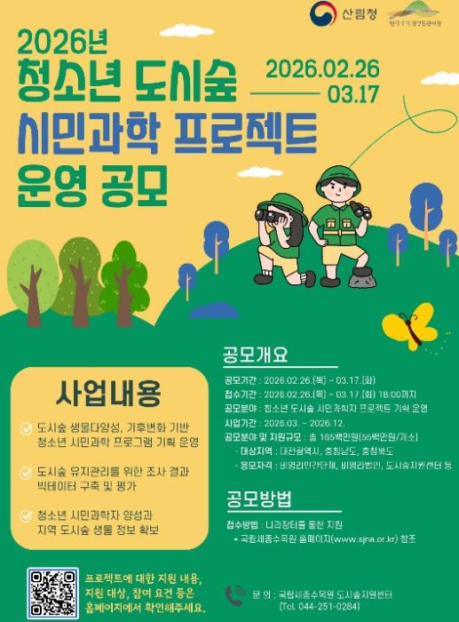 • 산림청은 녹색자금(복권기금)을 활용해 ‘2026년 청소년 도시숲 시민과학 프로젝트’를 본격 추진한다고 20일 밝혔다.