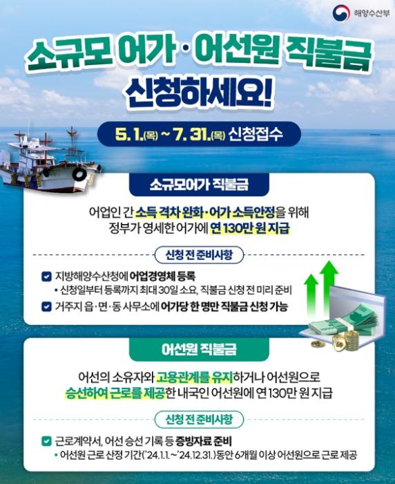 ‘소규모어가 직불금’은 5톤 미만의 연안어선(구획)어업 어가 또는 연간 어업판매액 1억 원 미만의 양식어업 어가를 대상으로 하며 연 130만 원을 지원한다.