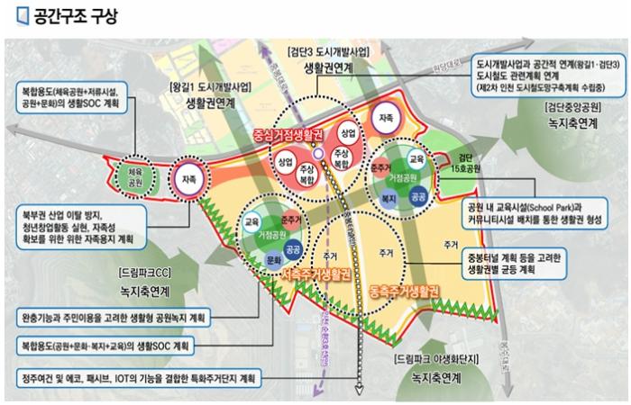 이번 개발계획은 사업대상지 규모와 순환골재적치장 처리 시기 등을 고려해 중봉대로를 기준으로 동측 생활권(사월마을 일원)과 서측 생활권(순환골재적치장 구간)으로 분리하되, 녹지축 연계와 생활권 중심지 연결계획 등을 통해 통합적이고 체계적인 마스터플랜을 수립한 것이 특징이다.