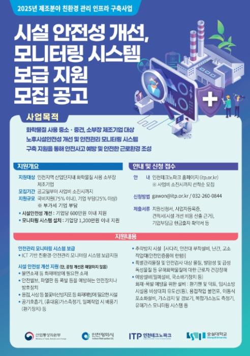 • 인천테크노파크(인천TP)는 인천 지역 산업단지 내 중소·중견 소부장 제조기업의 안전한 근로환경 조성을 지원하기 위해 ‘2025년 제조분야 친환경 관리인프라 구축사업’을 추진하며, 6월 4일까지 참여기업을 모집한다.